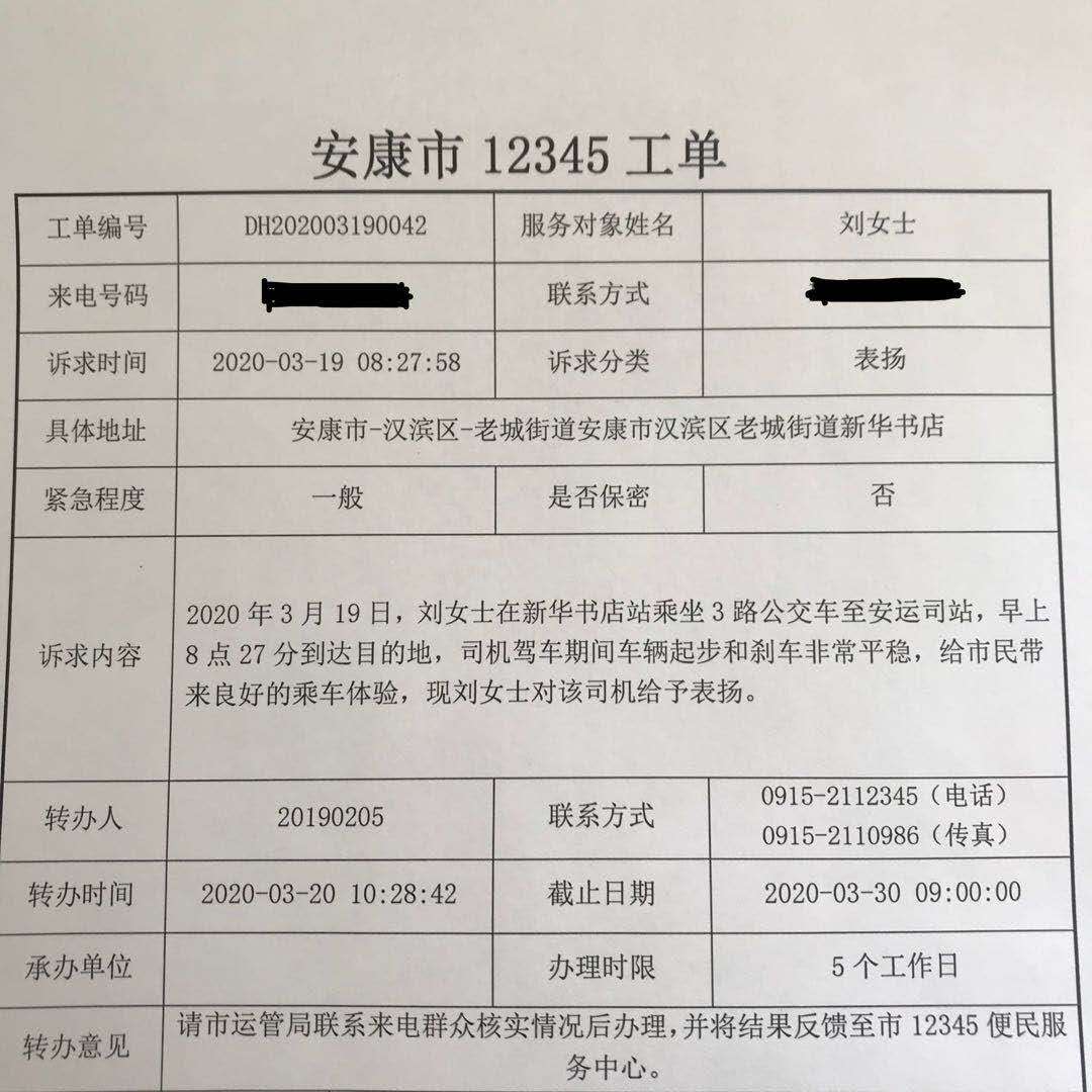 3路公交途经地区路况复杂,客流量大,但驾驶员喻祥根师傅在当班期间,用自己娴熟的技术和优质的服务为乘客带去了愉快的乘车体验。为此乘客刘女士特通过12345服务平台表达自己的敬意。