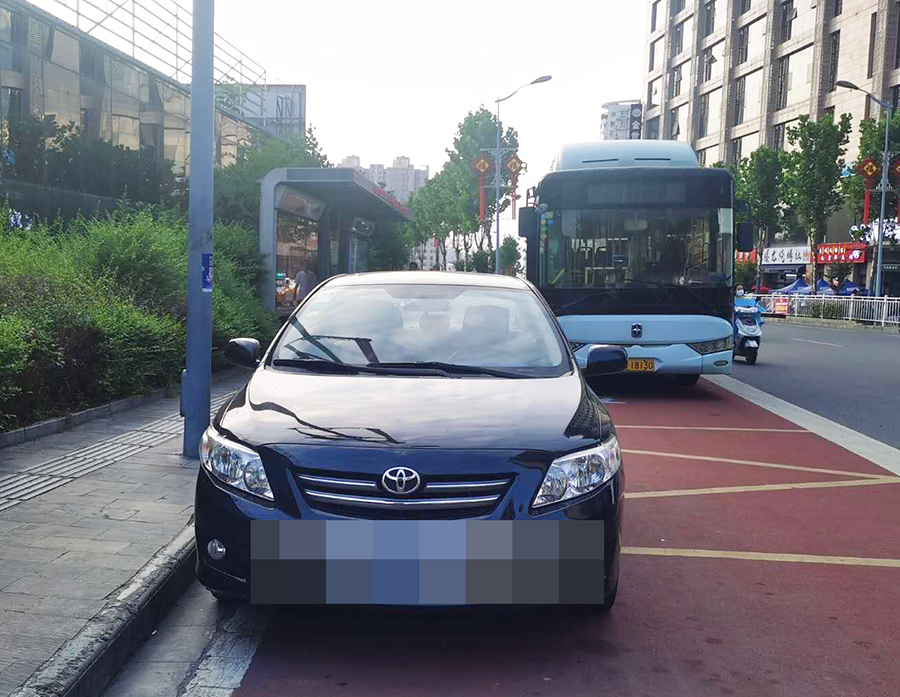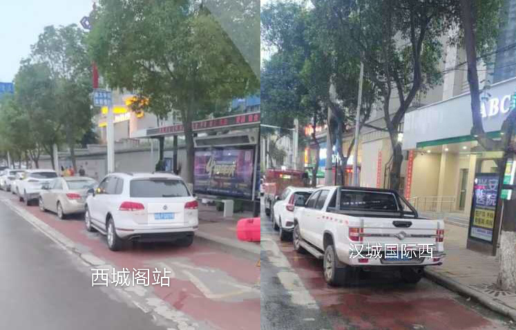 在金州广场南站,十几辆私家车“整齐划一”的停在公交车站位置,地面红色区域上的公交两字也被完全覆盖,从远处望去,站牌旁坐着几个人正等待公交车的到来。在兴华名城站,一辆私家车停靠在公交车站前,驶来的公交车无法按其规定进站停车。在西城阁站和汉城国际西站,几辆私家车甚是“任性”,俨然将公交车站当成了“停车场”,笔者在此驻足十几分钟,它们依然“纹丝不动”,有的车上甚至没有车主。