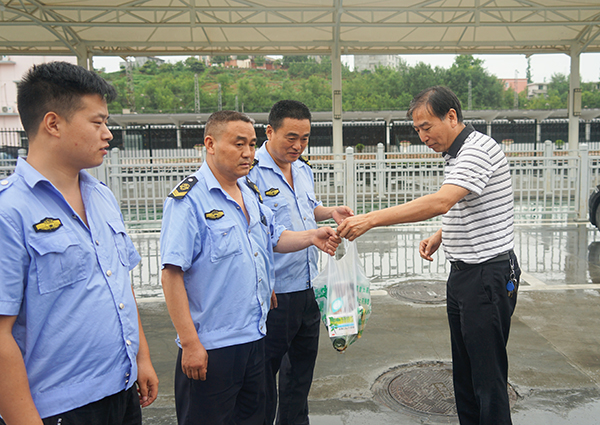 在火车站调度室,张晓强一行检查当日带班领导、值班人员在岗在位情况,了解值班值守落实制度、工作安排和落实等情况。为驾驶员送去了毛巾、菊花茶、花露水、风油精等降温物品,与他们一起拉家常,详细询问身体情况、工作和生活现状,认真倾听面临的困难诉求和对当前工作的意见建议,叮嘱他们做好夏季防暑降温、安全运营工作。