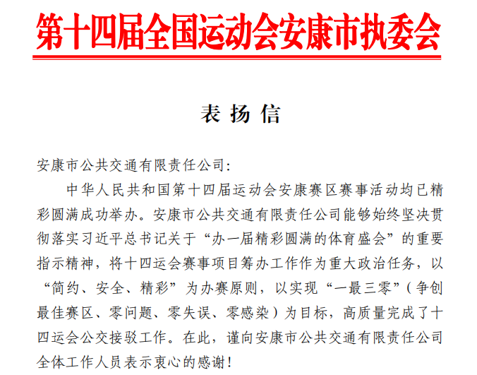 近日,第十四届全国运动会安康市执委会向点点官网发来表扬信,对公交公司高质量完成十四运会公交接驳工作表示感谢。