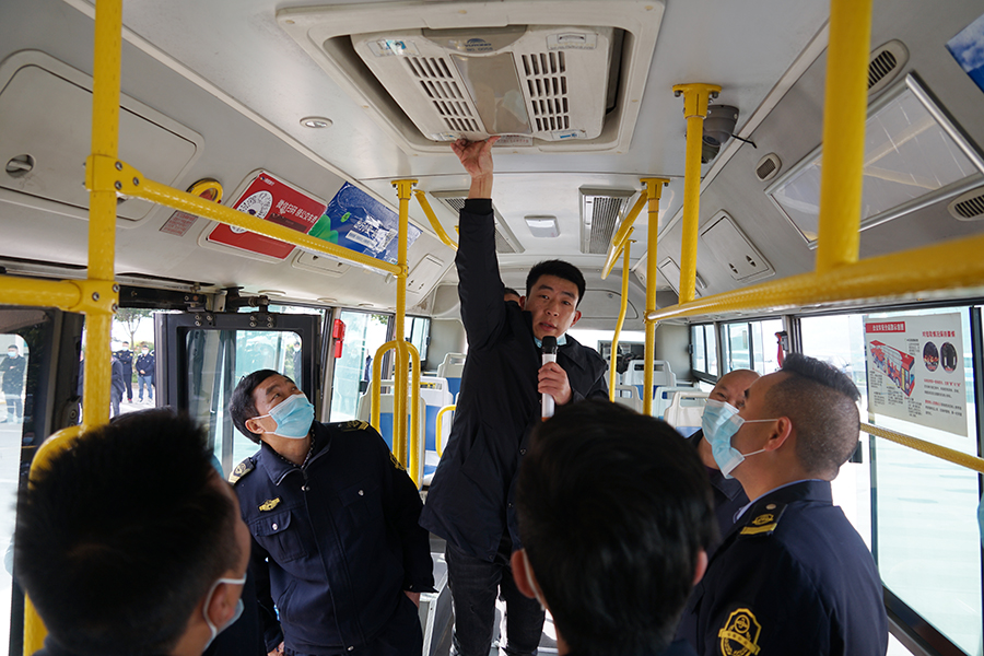 公交车静态安全演练主要考察驾驶员对公交车内安全锤、灭火器和手动开门按钮在公交车内放置的位置、紧急逃生路线图是否明白清楚,如何检查燃气管道漏气和切断燃气总阀等。