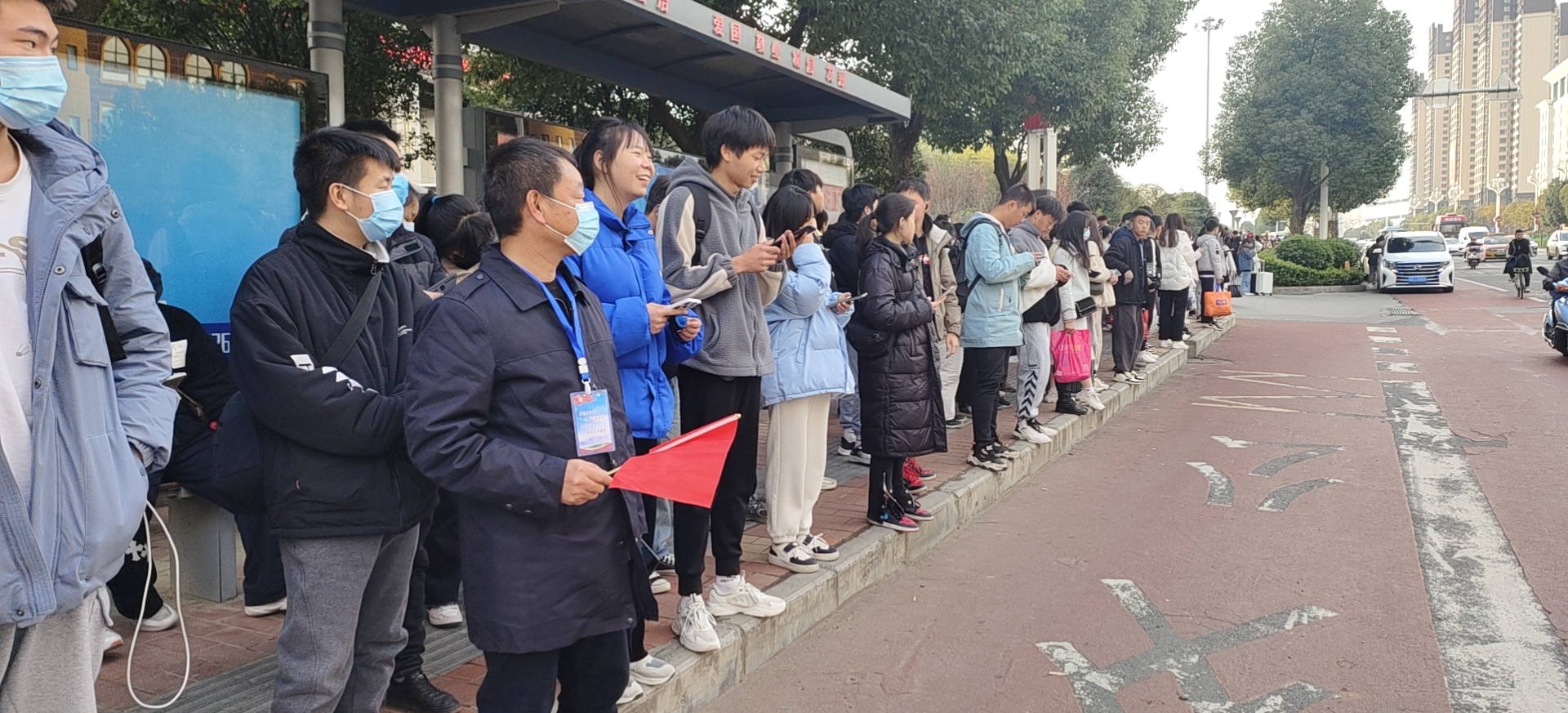公交站台旁,志愿者们引导乘客自觉有序排队乘车,提醒他们提前准备好乘车码或公交卡,耐心回答乘客咨询的问题,并维持车辆进站秩序,有效缓解公交站台乘客上下车的交通压力。