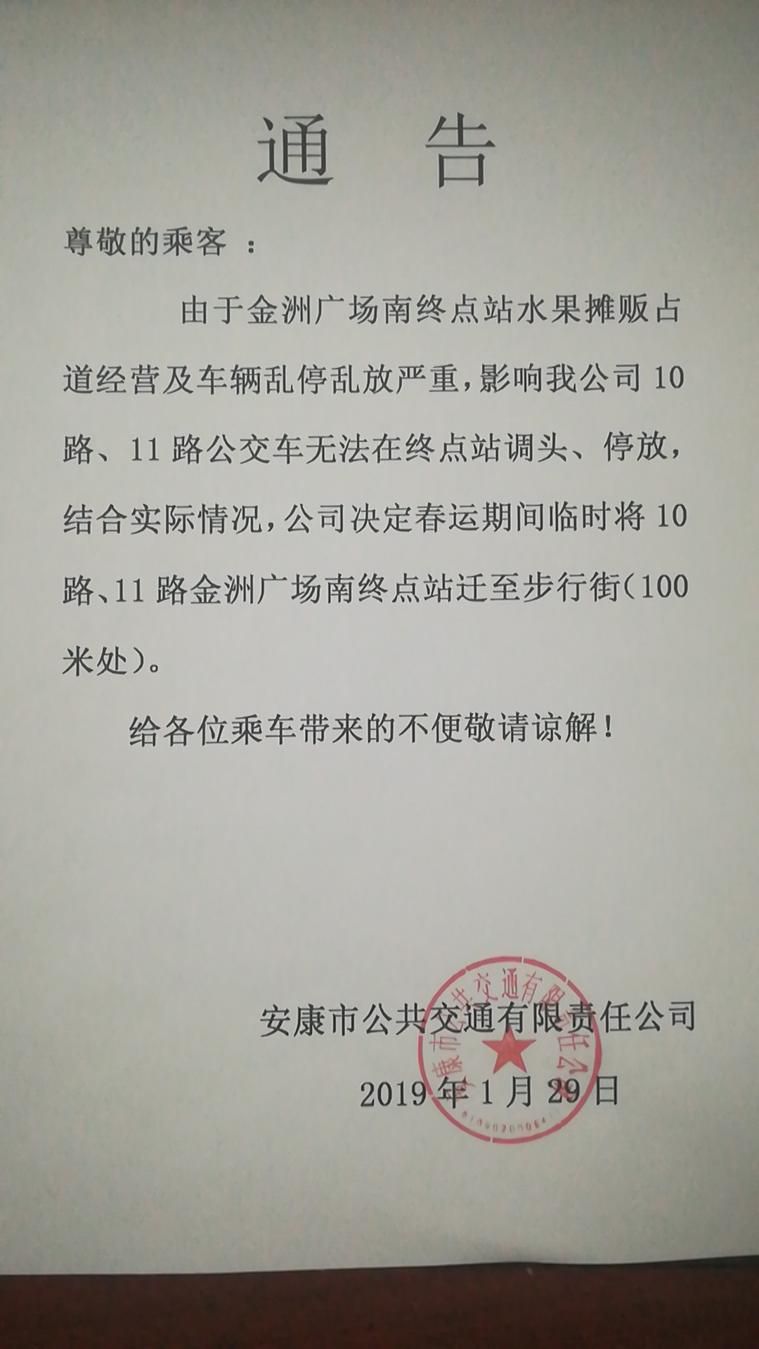 由于金洲广场南终点站水果摊贩占道经营及车辆乱停乱放严重,影响我公司10路、11路公交车无法在终点站调头、停放,结合实际情况,公司决定春运期间临时将10路、11路金洲广场南终点站迁至步行街(100米处)。